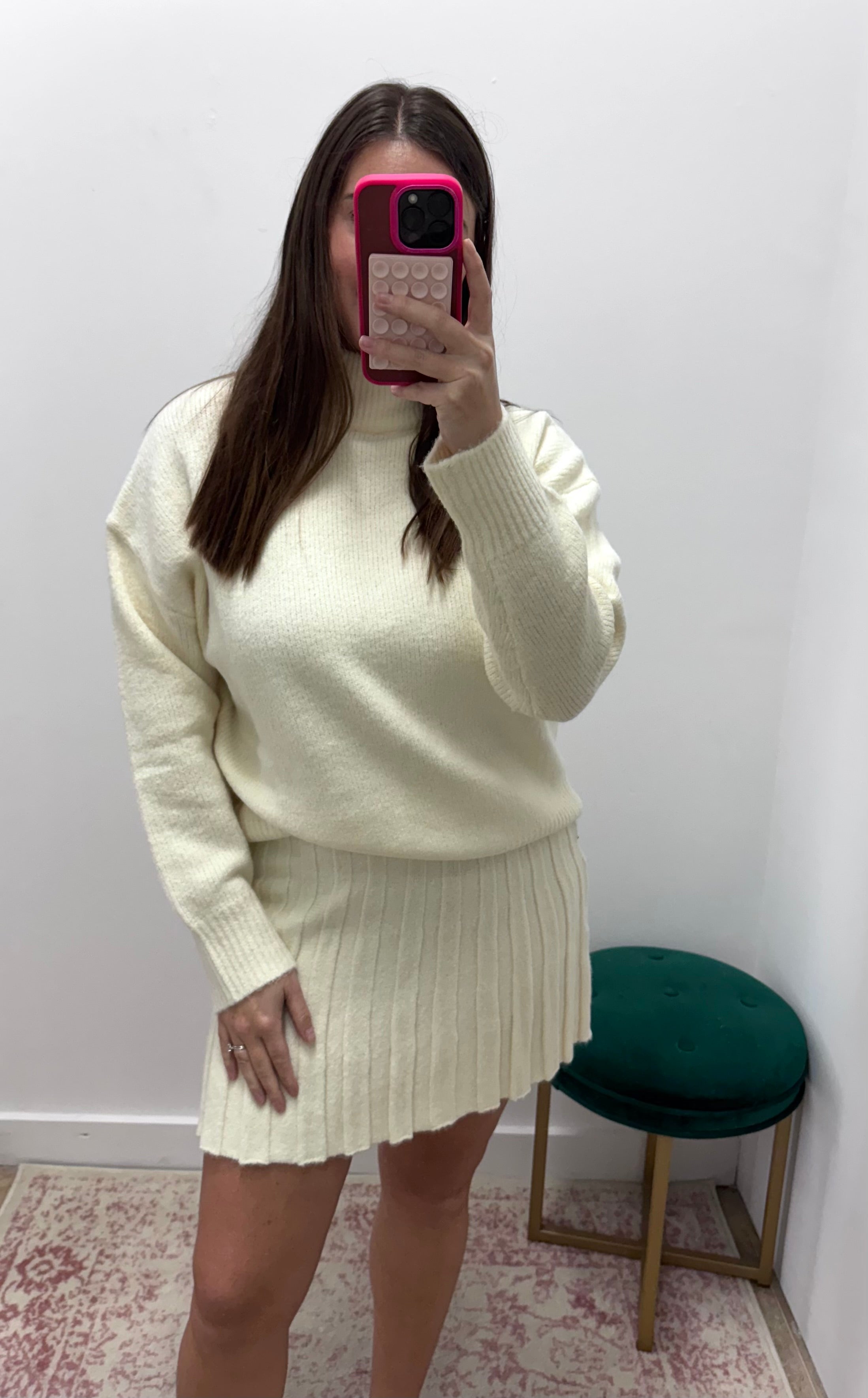 Turtleneck Pleated Skirt Set- Cream