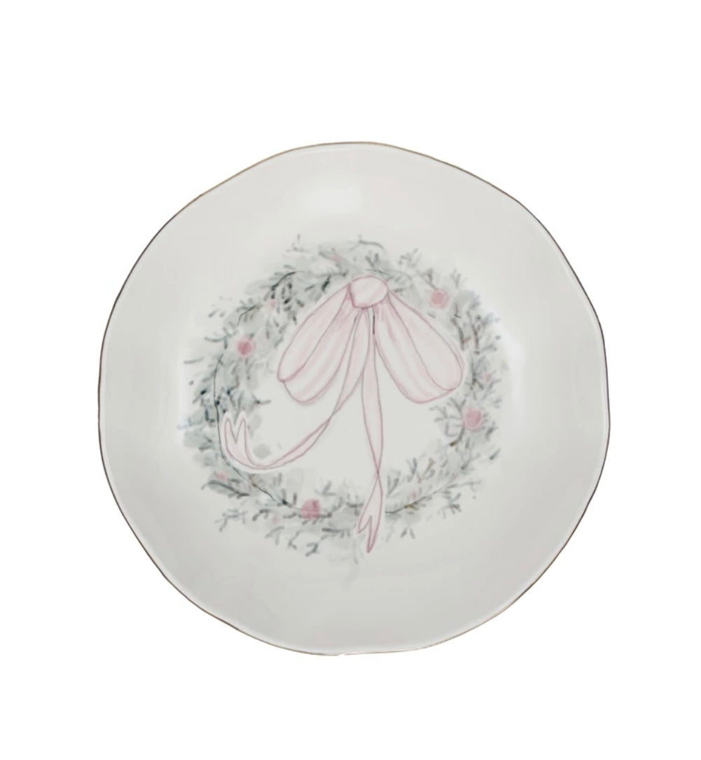 The bowl is made of durable and high-quality stoneware with a smooth and glossy surface. It is easy to clean and dishwasher-safe. The bowl measures 10.5 inches in diameter and 2 inches in height. This stoneware wreath and gold bowl is a wonderful gift for anyone, especially during the winter or holiday season. A festive and elegant bowl with a wreath design and gold electroplating accents. A stunning and sophisticated piece that can enhance any winter or holiday-themed table setting. Can be used for serving soups, salads, snacks, or desserts, or as a decorative accent on a table or shelf.