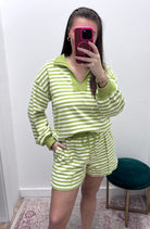 Striped long sleeve knit top with matching shorts featuring contrast split v neck collar and ribbed cuffs. Unlined. Knit. Non sheer and lightweight.