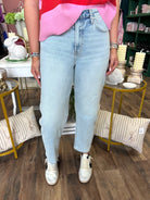 Comfort stretch denim, super high rise waist, 5 pockets, finished hem, ankle length, light wash, barrel leg jeans
