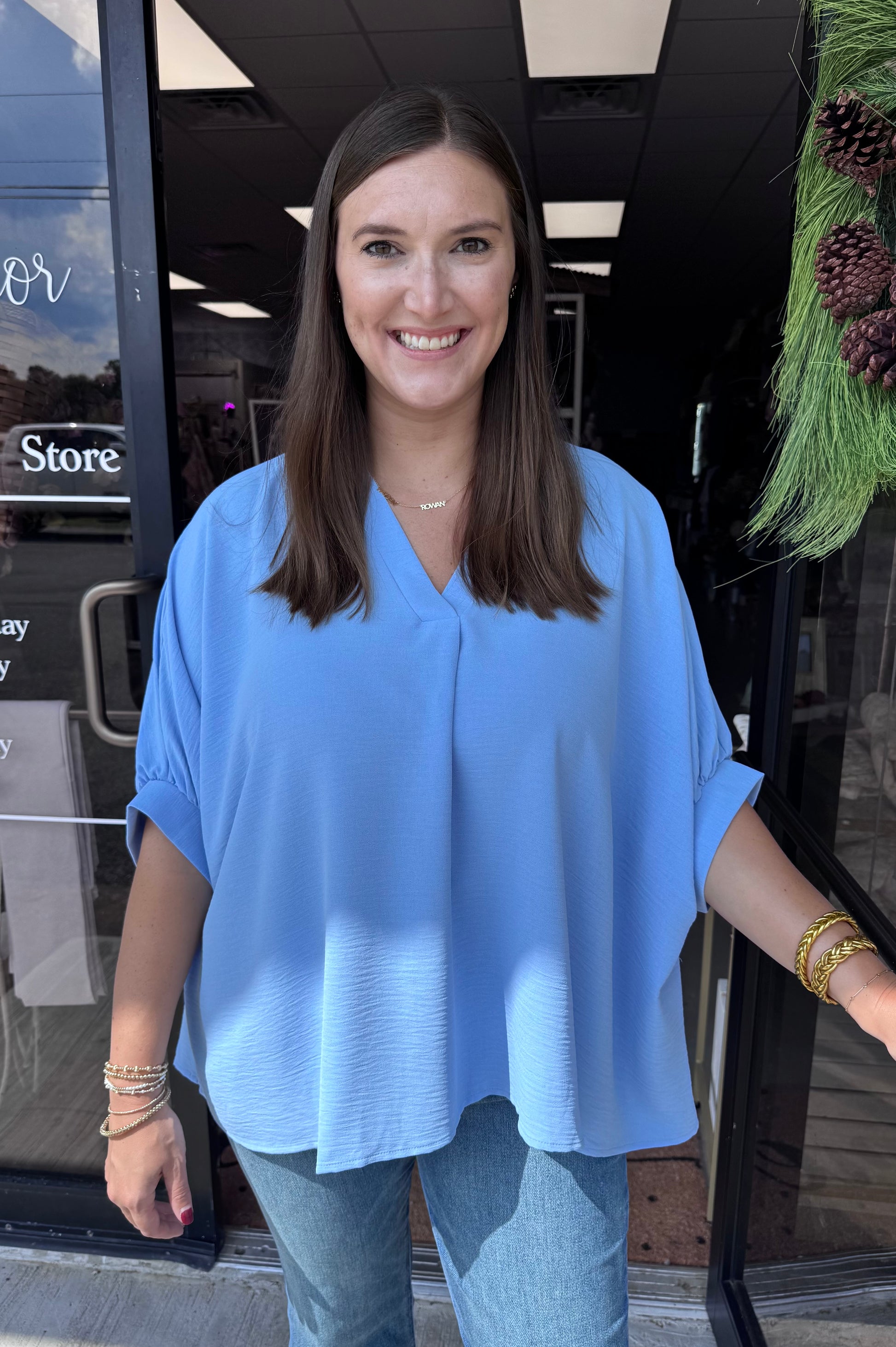 Half Sleeve Woven Top- Spring Blue