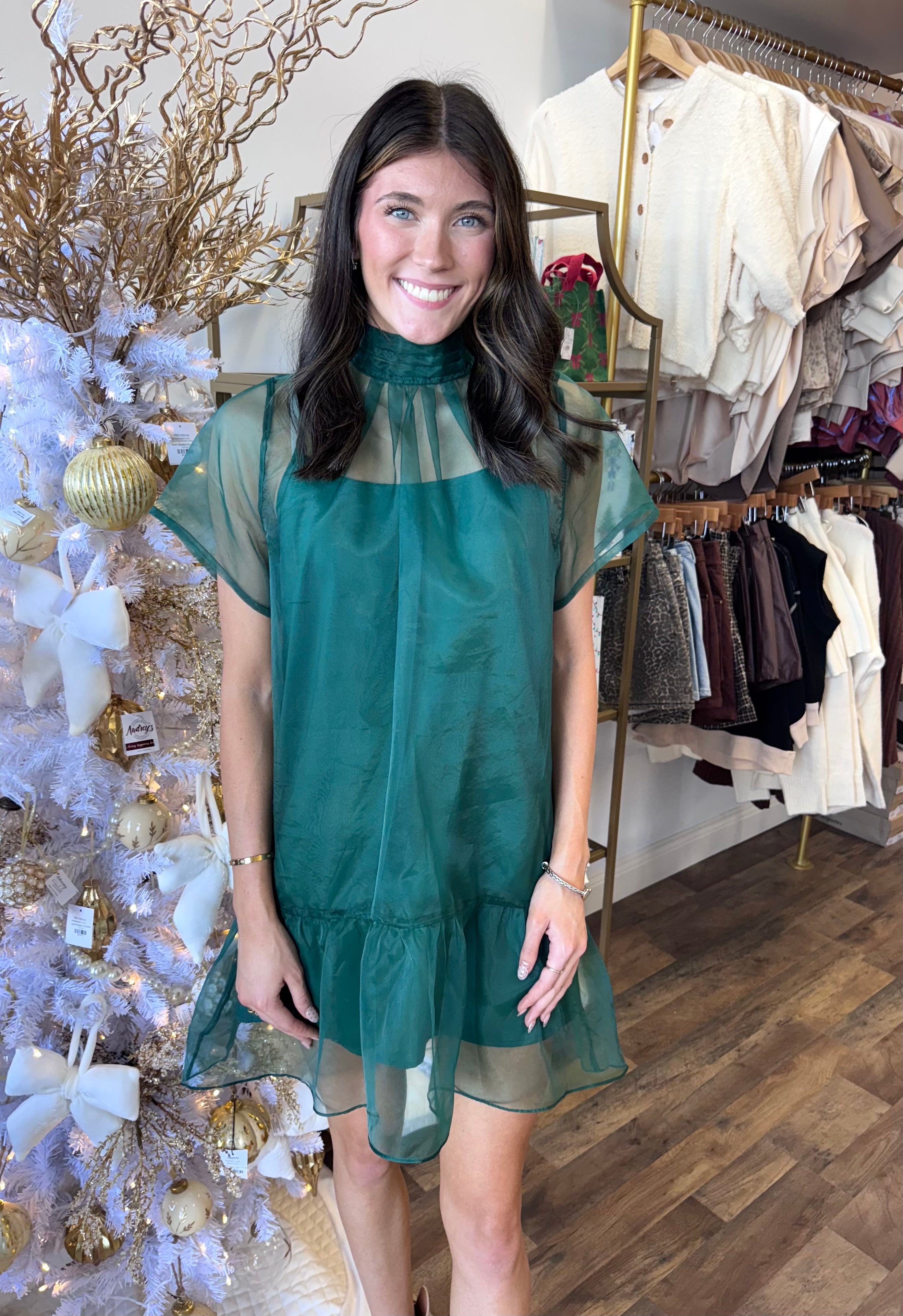 Jenna Organza Mock Neck Mini Dress-Emerald