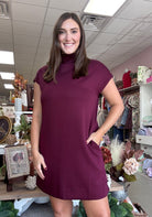 Solid jersey mock neck pullover mini dress. Side pockets. Unlined. Knit, non sheer. Lightweight