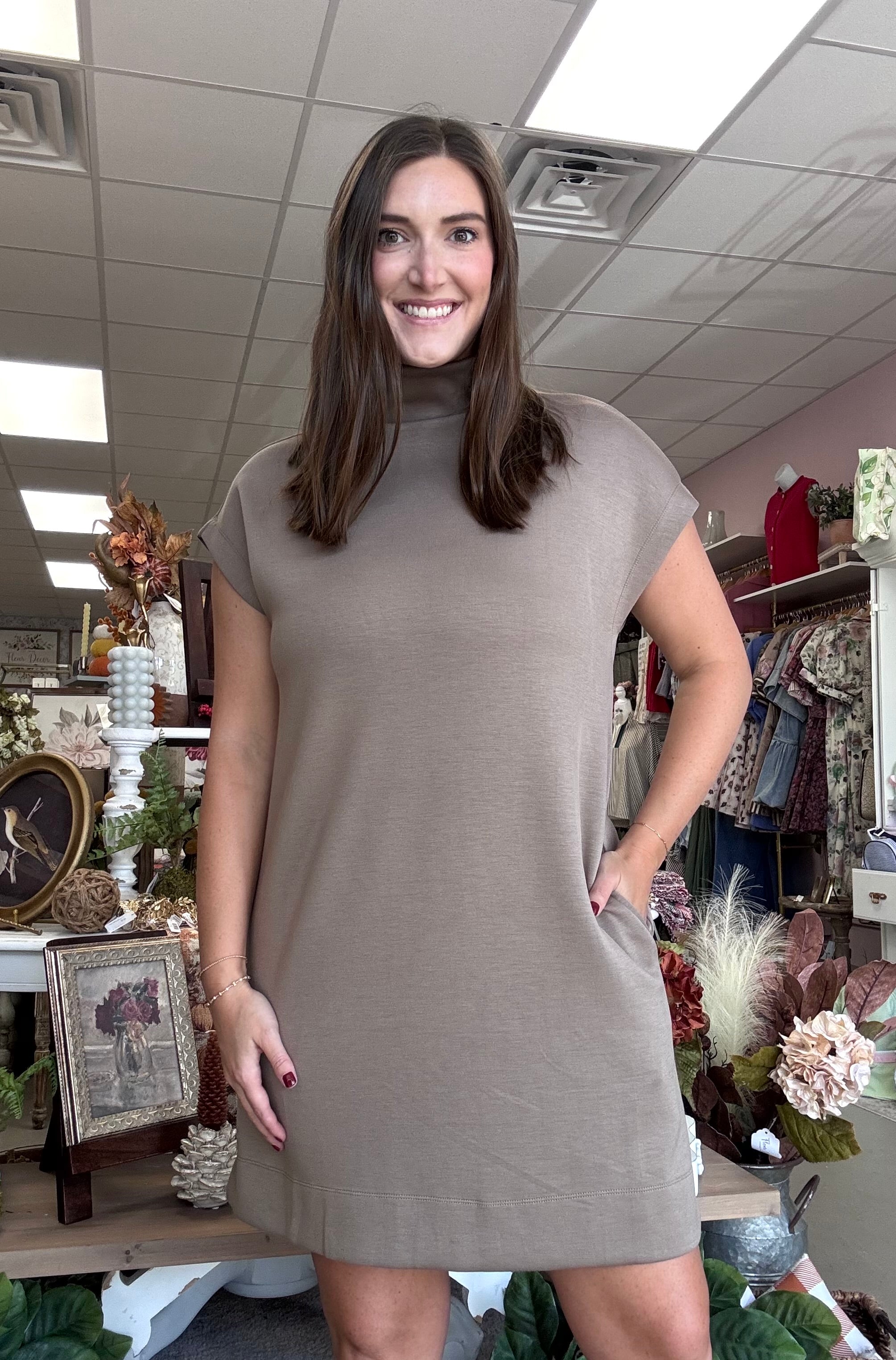 Solid jersey mock neck pullover mini dress. Side pockets. Unlined. Knit, non sheer. Lightweight