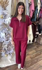 Scuba High Neck Half Zip Top & Pants Set-Burgundy