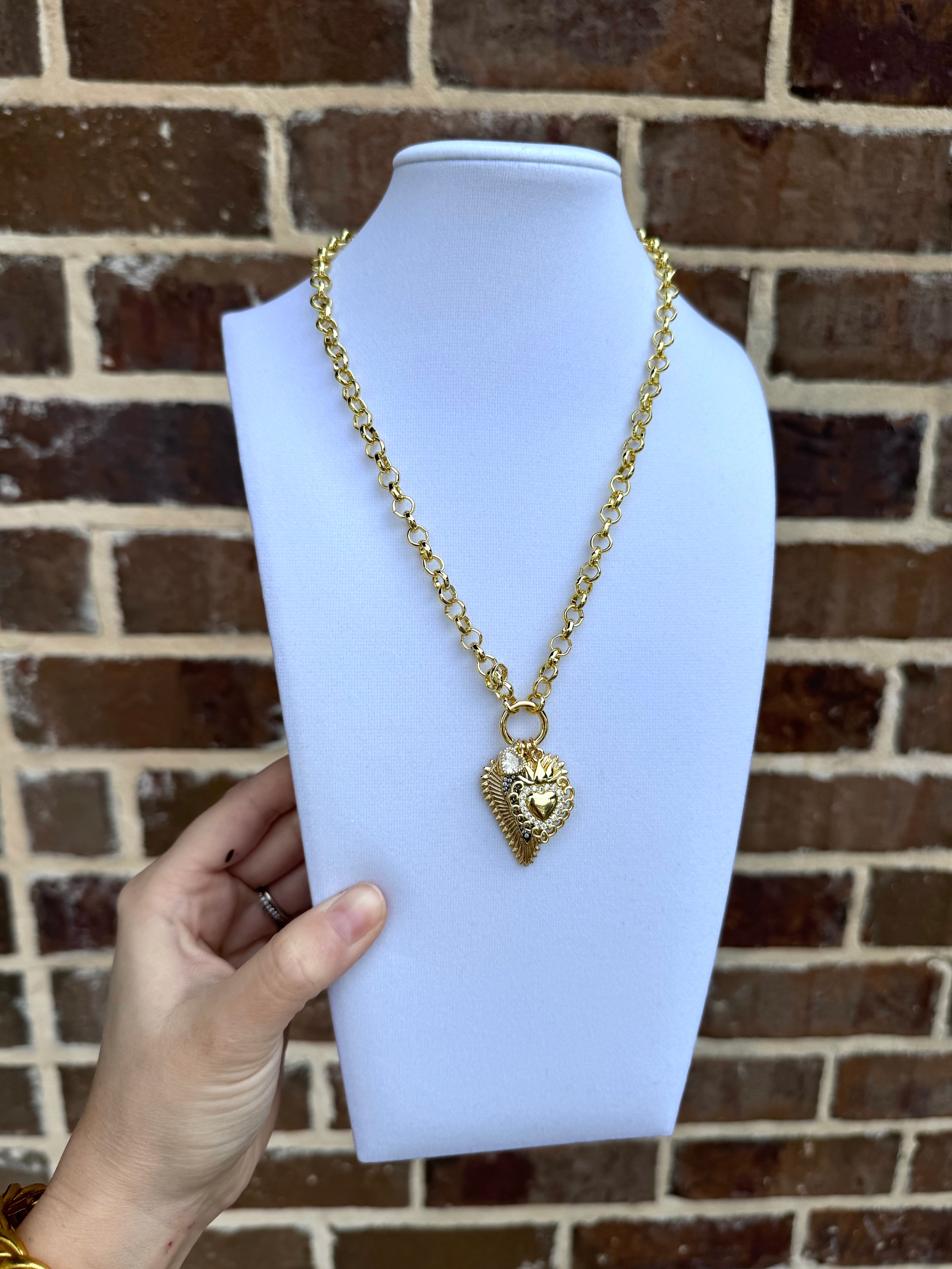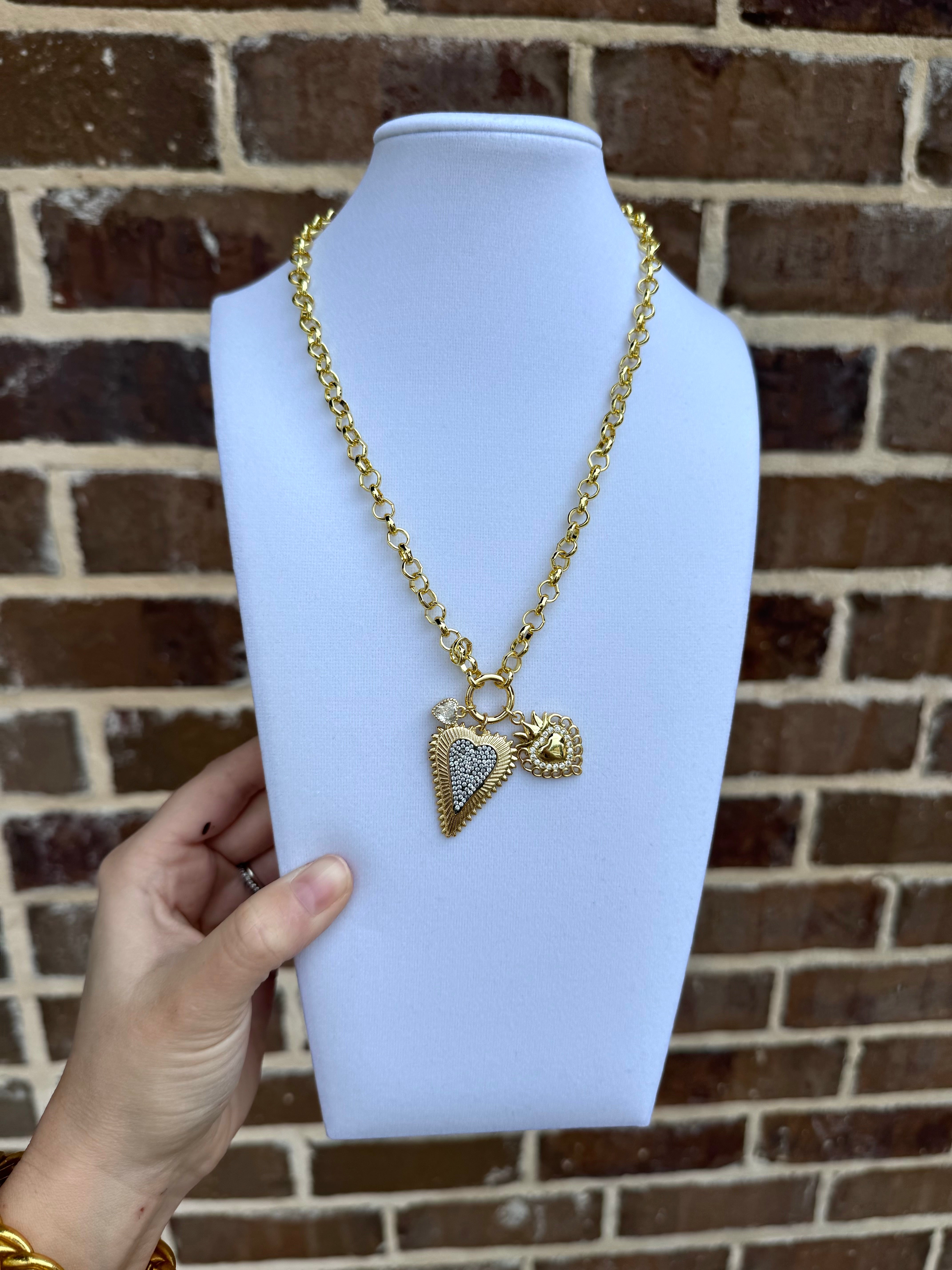 Gemelli necklace. 18k Gold plated 18" adjustable 3 heart charm necklace with CZ detail