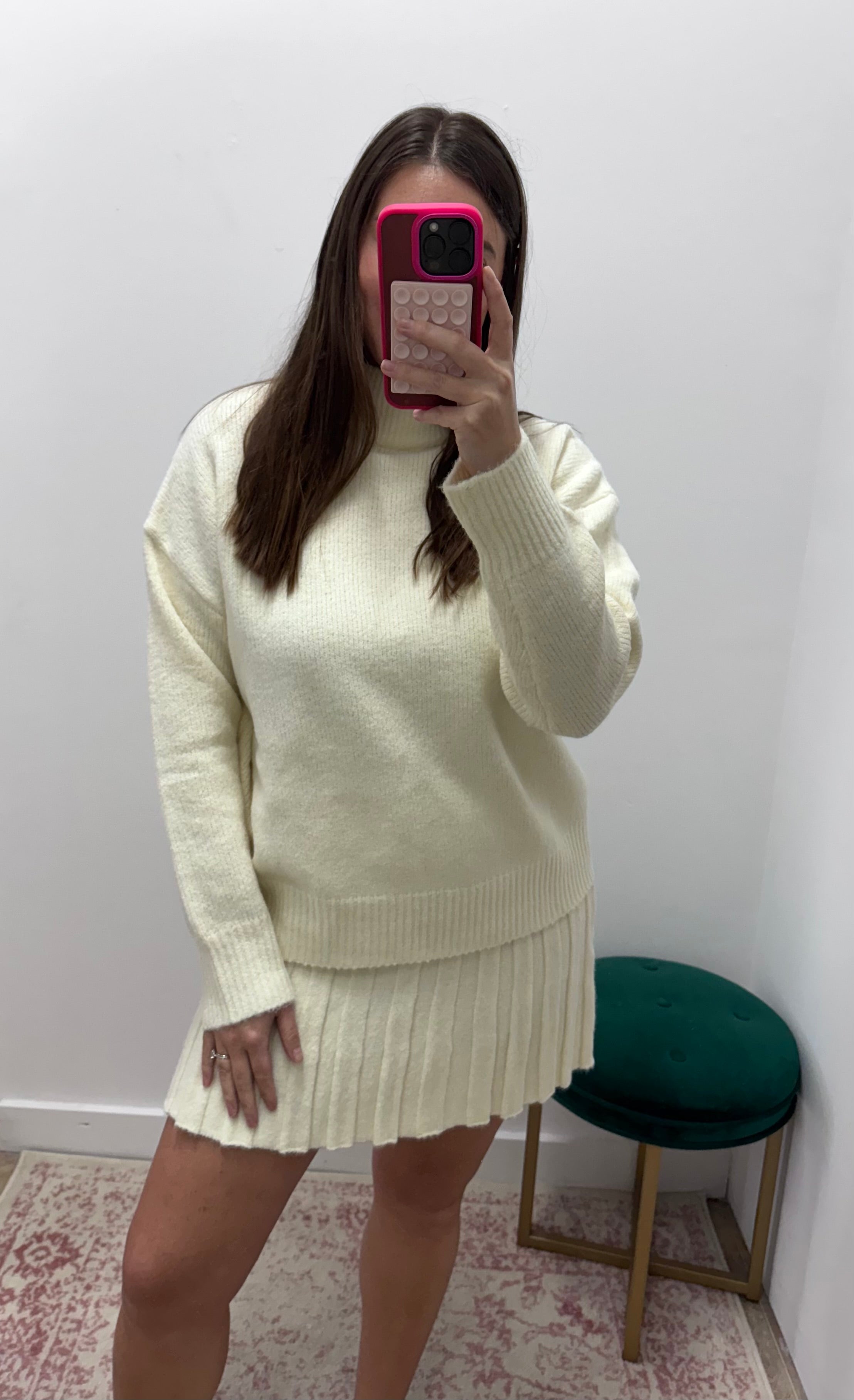 Turtleneck Pleated Skirt Set- Cream